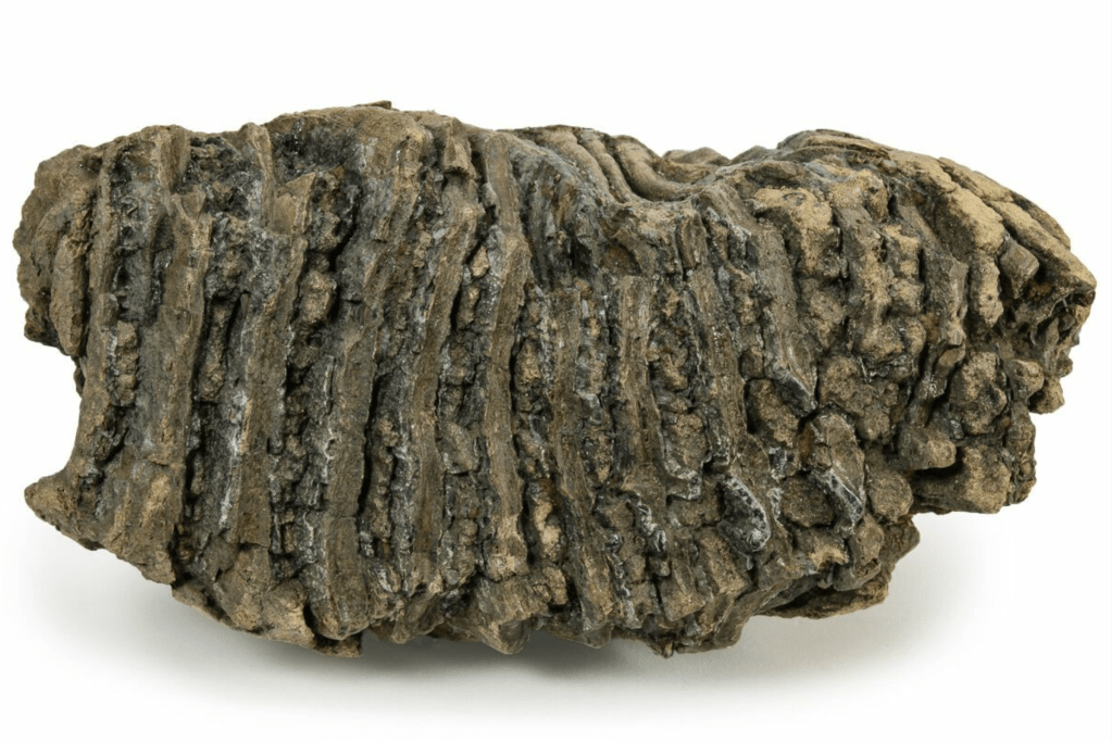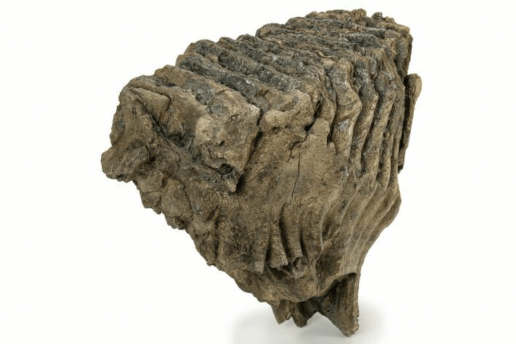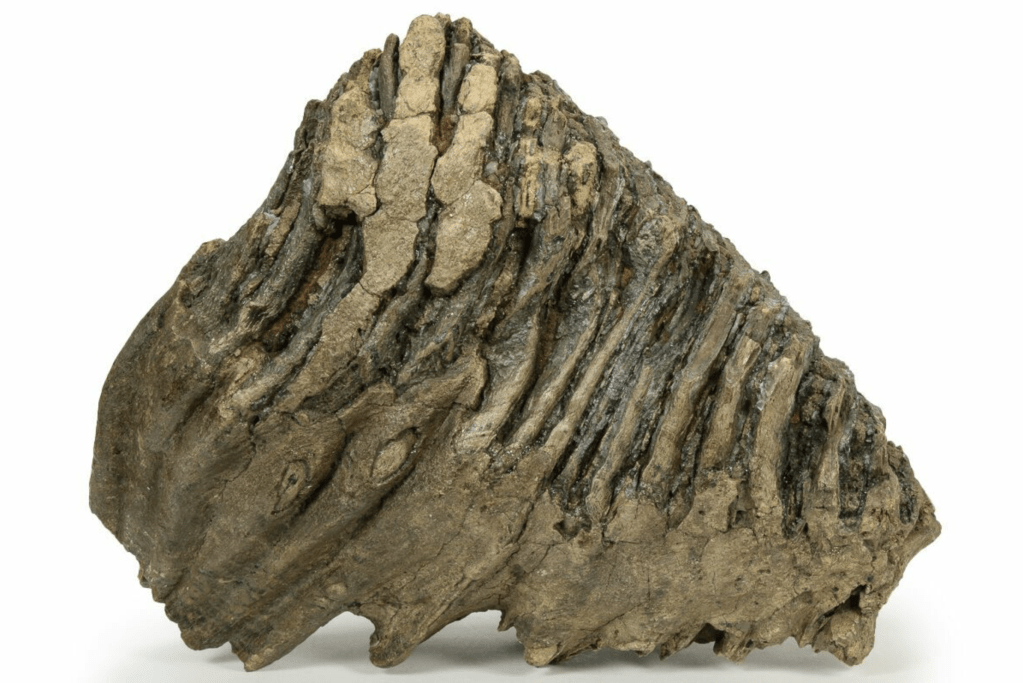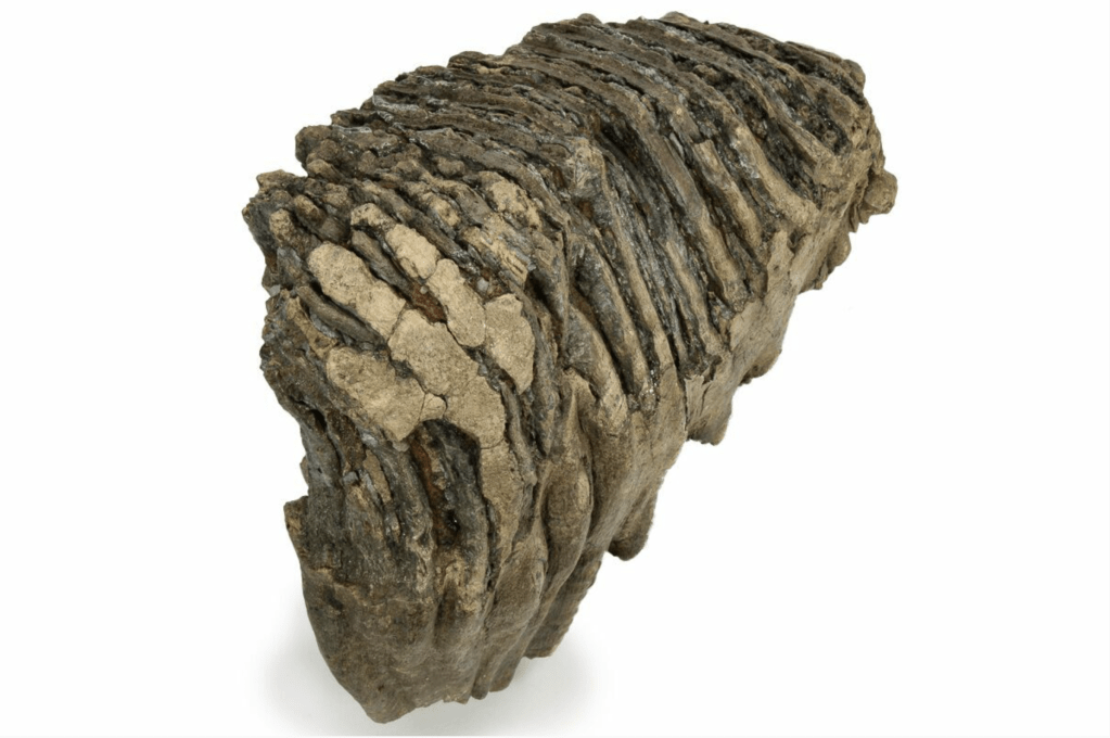 Woolly Mammoths only had four of these massive plant grinding molars for processing food, which they did in massive quantities. Each tooth (and tusk) would have been lost and regrown four times during a Mammoth’s life. This tooth shows some erosion, but displays a wide occlusal surface, where the enamel has been worn down and dentine is more heavily exposed.